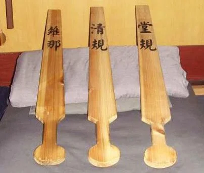 The wooden board (木板)is shaped like a double-edged sword (宝剑 – Bǎo Jiàn), and is used to keep order and discipline within the Chinese Buddhist Sangha. Within the Chán Buddhist monastic temple tradition (禅林 – Chán Lín), this device is referred to as the ”Fragrant Board” (香板 - Xiāng Bàn). This is a wooden board that is long and broad in structure, although its size, shape and weight often vary. However, generally speaking, the wooden sword is around two-feet long, and is wider at its base (usually two-inches wide) just above the handle. As it is used for a number of distinct purposes, it posesses a number of different names, and this explains why its size and shape varies. As a method of keeping the Dào 道 of order and clarity, it is known as the ”Official Method Fragrant Board” (警策香板 – Jǐng Cè Xiāng Bàn). As a method for discipning offenders (who have broken the Vinaya Discipline), it is known as the “Clear Rules Board” (清规板 – Qīng Guī Bàn). As a means of clearing a befuddled, confused, or fatigued mind experienced during seated meditation practice, it is known as the “Patrolling Fragrant Board” (巡香香板 – Xún Xiāng Xiāng Bàn). During a Chán week Meditation Retreat, it is known as the “Supervisory Fragrant Board” (监香香板 – Jiān Xiāng Xiāng Bàn).